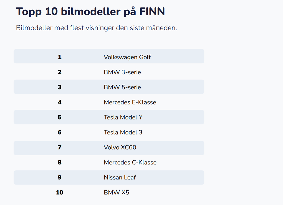 Volkswagen Golf var modellen med flest visninger på FINN i januar, etterfulgt av BMW 3-serie og BMW 5-serie. Tesla Model Y og Model 3 holder også posisjonen blant de mest ettertraktede bilene.